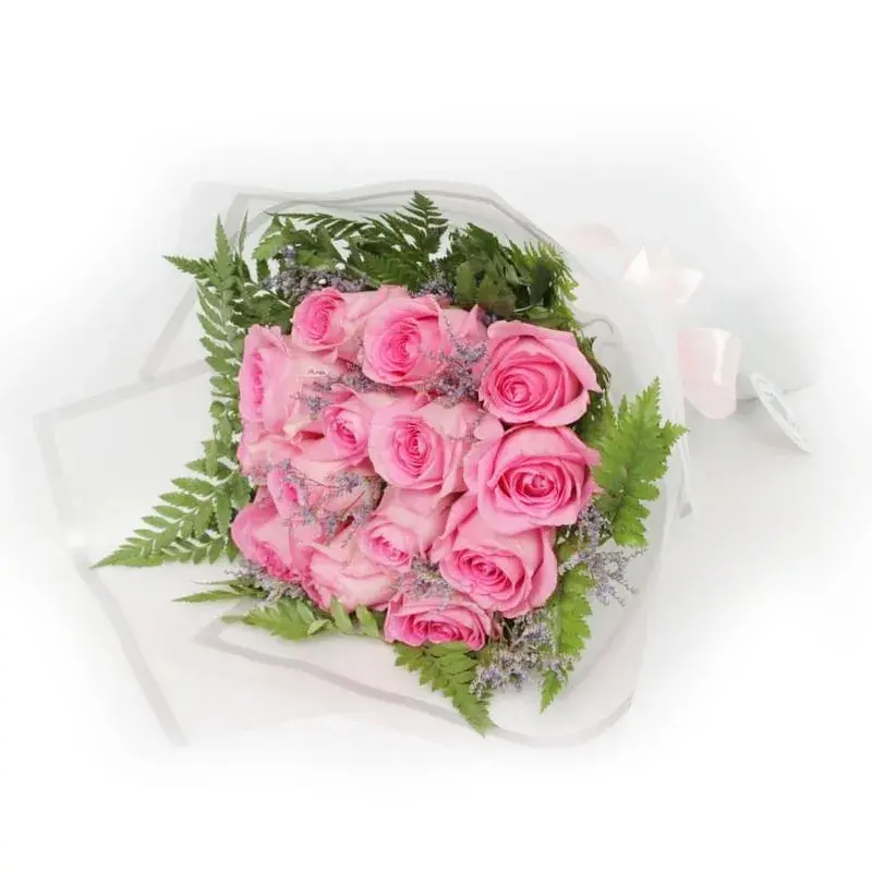 Arrangement of dozen pink roses in a bouquet for special person.