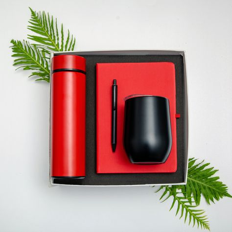A modern twist to Rakhi gifting—this set includes a bold red flask, matte black tumbler, pen, and red journal. Perfect for your corporate or college-going brother.